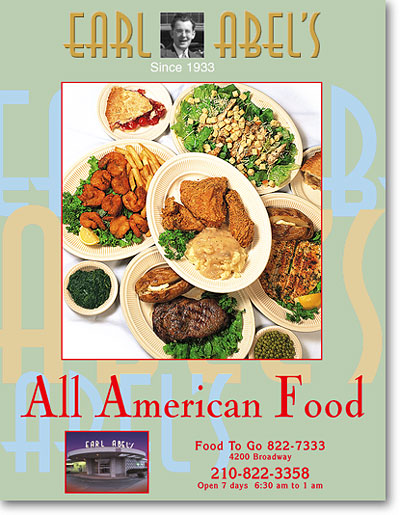 A full page, 4-color ad for Earl Abel's restaurant, this design