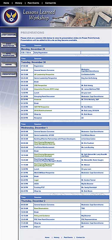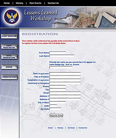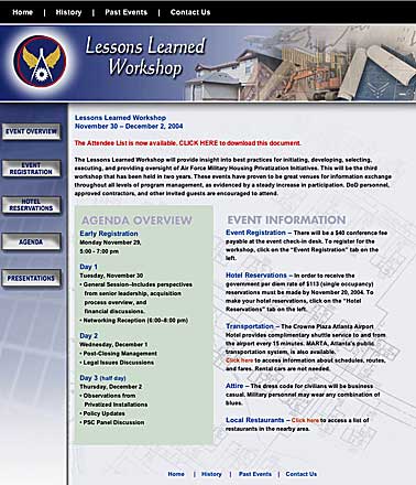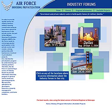 Created websites thruout 2004 for Booz Allen Hamilton. Sites were for events in various cities and included multiple step registration form pages. Events were for the private sector and contract work for Air Force locations in the United States.